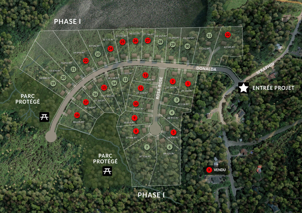 La phase 1 propose 32 terrains résidentiels avec services d'aqueduc municipal pour un mode de vie sain et sécuritaire.